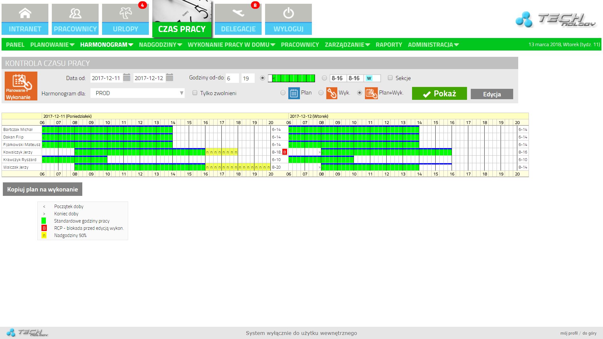 Wykorzystując program do tworzenia harmonogramu pracy, kierownik działu w wygodny sposób - za pomocą kilku kliknięć - zaplanuje działania swoich pracowników. System umożliwia też sprawną kontrolę planowanego i przepracowanego czasu zgodnie z nominałem w okresie rozliczeniowym.